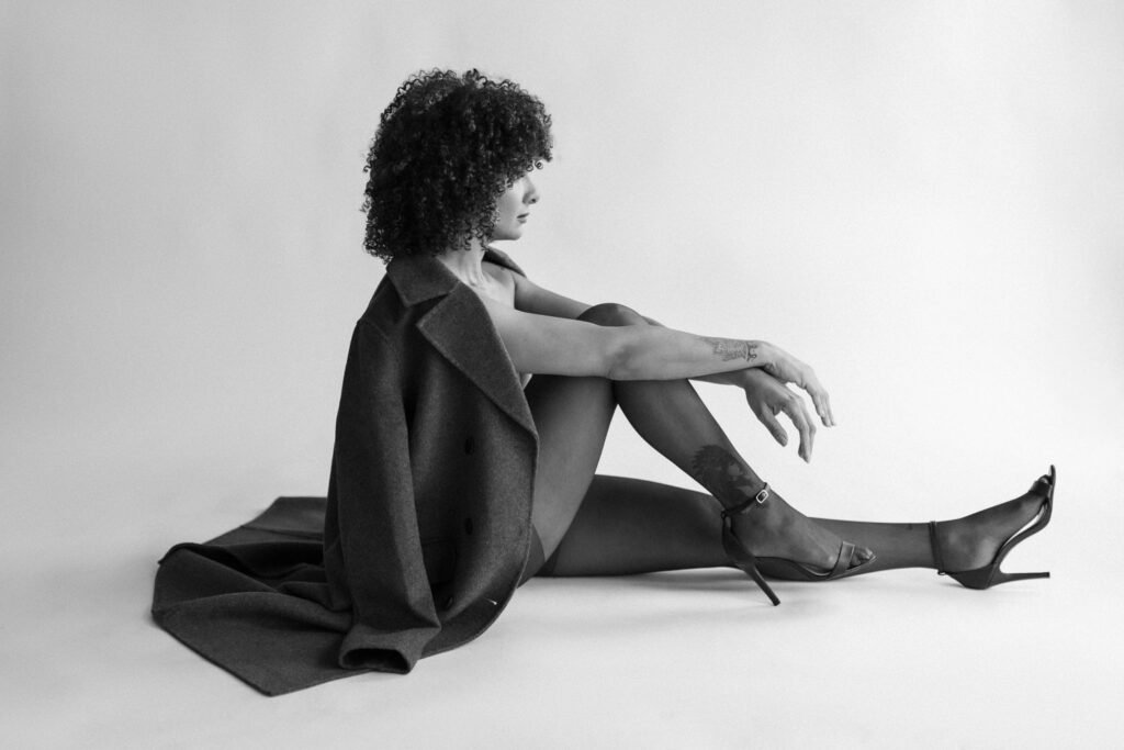 In this artistic professional photoshooting, I chose to combine contrasting fashion elements: a structured tailored coat — a symbol of strength and form — with delicate, feminine pieces such as high heels and sheer tights.